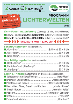 Der Sommer neigt sich langsam dem Ende entgegen, die Tage werden wieder deutlich kürzer und die Dämmerung hält an diesen Spätsommertagen das ein oder andere Highlight bereit. So auch im OTTER-ZENTRUM: Denn am 12. und 13. sowie 19. und 20. September stehen die LICHTERWELTEN 2025 auf dem Plan – und ein Blick auf das Programm verspricht: Es wird wieder spektakulär!