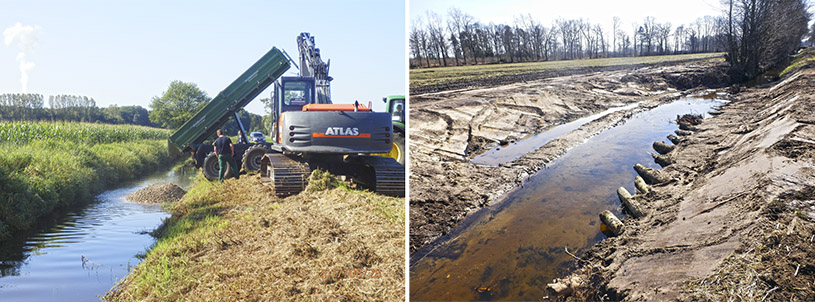 Zur Aufwertung der Fließgewässer zählt der Einbau von Kies und Totholz im Niedrig- und Mittelwasserbereich im Gewässerbett. Hierdurch kann nicht nur die Struktur- und Lebensraumvielfalt deutlich erhöht werden, sondern durch die Einengung der zu großen Gewässerprofile wird auch in Niedrigwasserzeiten das Wasser gehalten und die aquatischen Lebensräume bleiben für die Gewässerlebewesen erhalten.