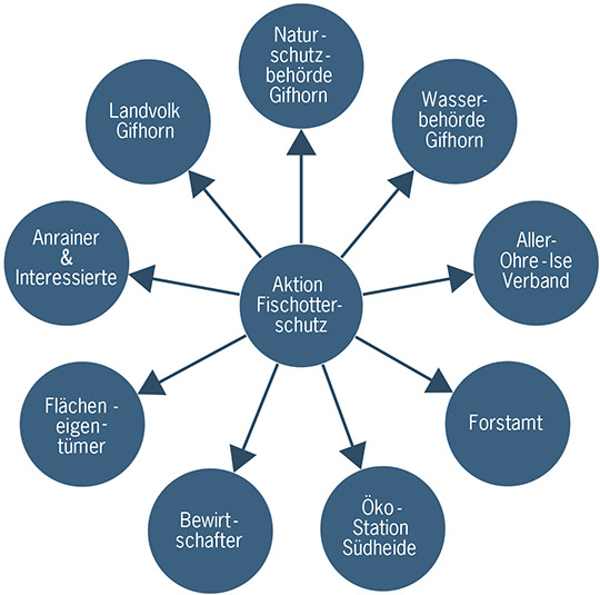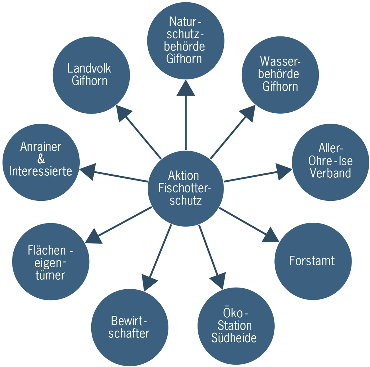 Mit dem Ziel einen Naturschutz zu betreiben, der von der Bevölkerung getragen und unterstützt wird, erfolgt die Planung und Umsetzung von Naturschutzmaßnahmen grundsätzlich in Zusammenarbeit mit den lokalen Akteuren (Behörden, Verbände, Vereine, Anlieger und Nutzer). Begleitet wird das Projekt durch eine gezielte Öffentlichkeits- und Kommunikationsarbeit. Hierdurch soll das Bewusstsein und die Wertschätzung der Blau- Grünen- Infrastruktur gesteigert werden.